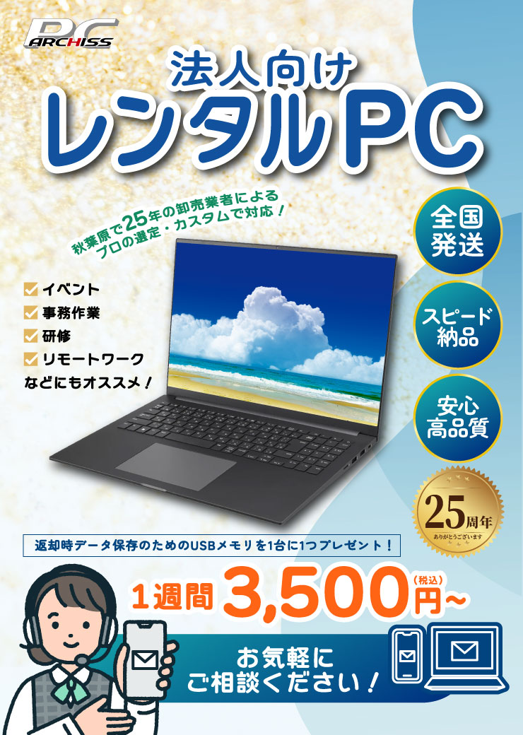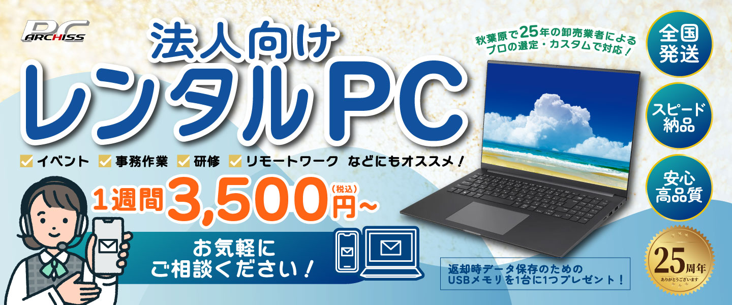 中古PC・法人向けPCレンタル・法人向けInsta360レンタルのサービスを行う ARCHISS PC(アーキスPC)です。秋葉原で25年の株式会社アーキサイトが運営する、レンタル・中古事業です。
